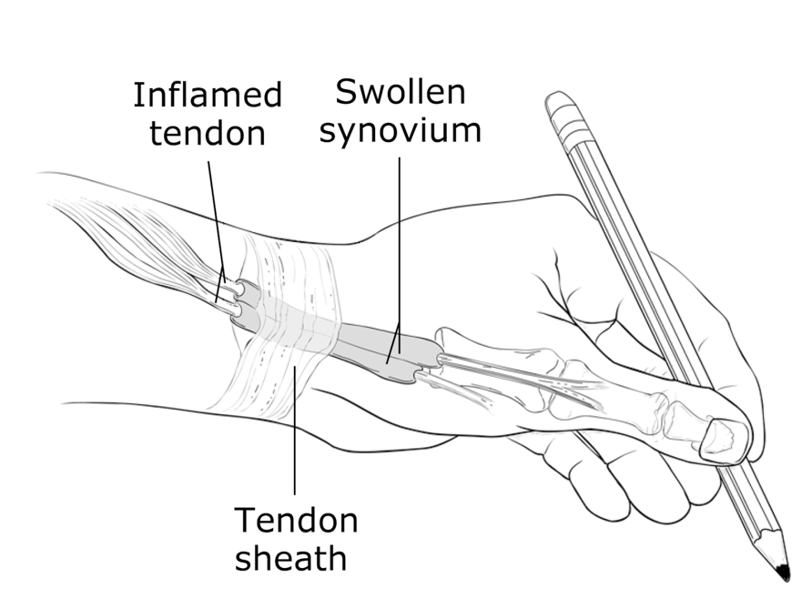 Two primary tendons (the abductor pollicis longus and extensor pollicis brevis) run along the thumb side of the wrist. They glide through a protective tunnel lined with a lubricating tissue called the synovium.